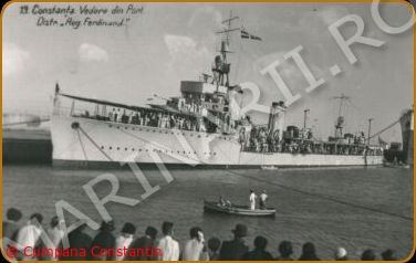 Distrugatorul REGELE FERDINAND in portul Constanta. NOTA: A?n discuALiile lor intime, marinarii obiAYnuiau s?f boteze navele de r?fzboi; astfel, canonierele erau DomniAYoarele, distrug?ftoarele, cAcnd erau mai multe la un loc, Cucoanele; cAcnd era numai unul, „Regele Ferdinand??o, era numit Fl?fc?ful sau Dumnealui, iar „Regina Maria??o era Dumneai; nava-baz?f era numit?f Mama noastr?f, iar submarinul „Delfinul??o era Marinic?f sau A?mecherul (Constantin CUMPANA).
